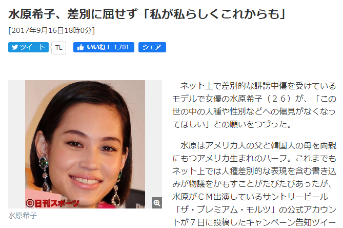 2017年,水原希子代言了一款啤酒,但广告还未播出,就有不少日本网友到广告商的SNS下面留言,要求下架她的广告。